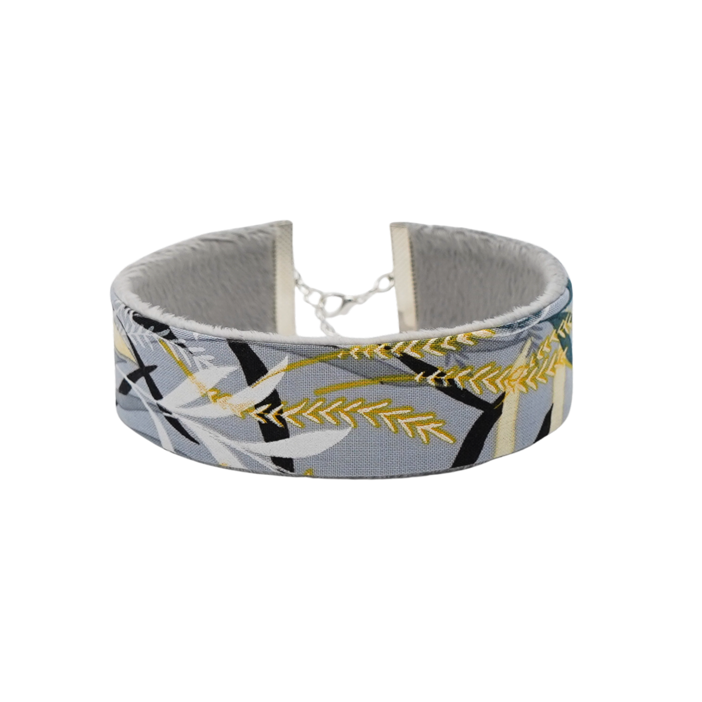 This handmade fabric choker necklace features a stylish front facing fabric, and a super soft, cuddly, gray fabric on the back for extra comfort! The jewelry ends are silver-plated and have an extension chain with a charm.