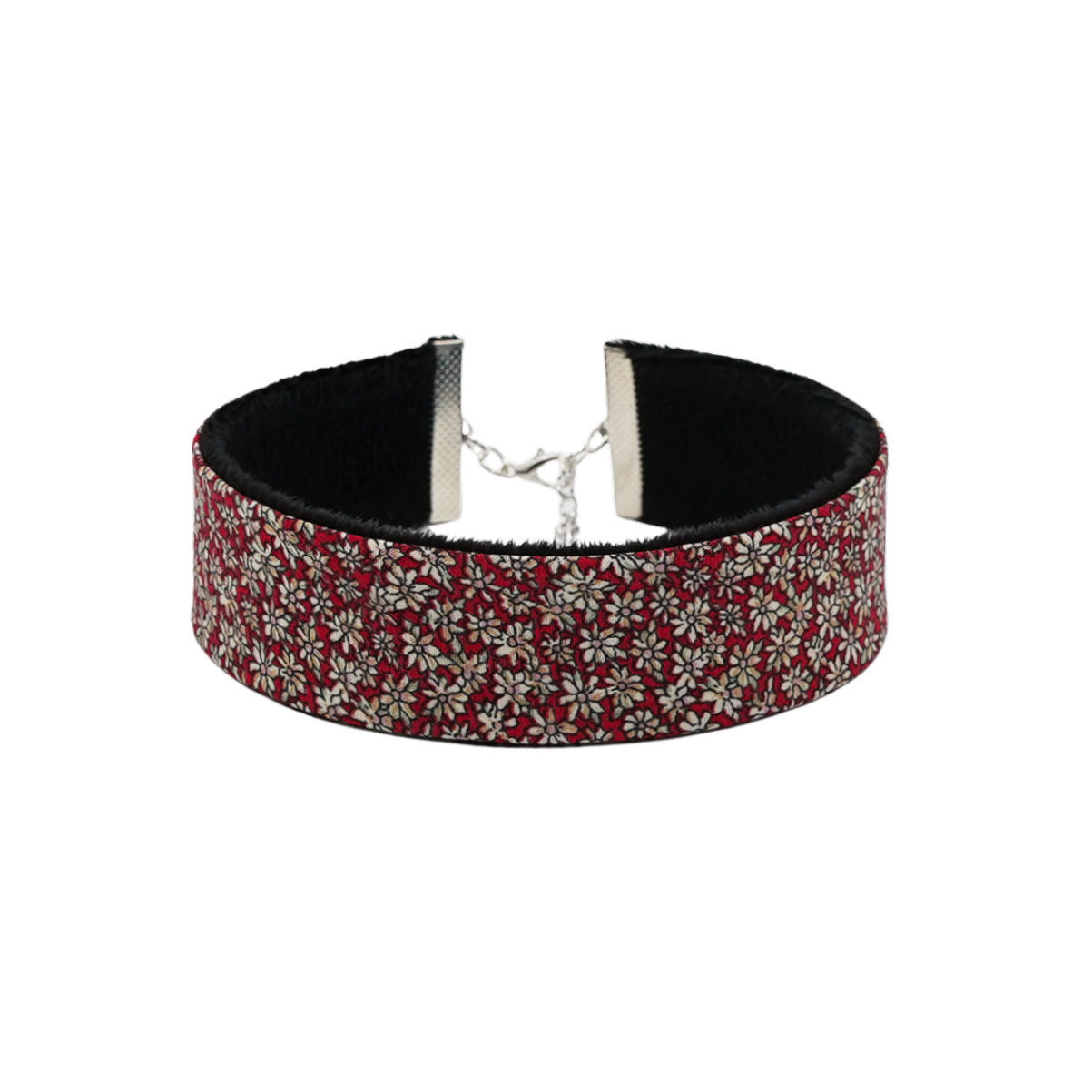 This handmade fabric choker necklace features a stylish front facing fabric, and a super soft, cuddly, black fabric on the back for extra comfort! The jewelry ends are silver-plated and have an extension chain with a charm.